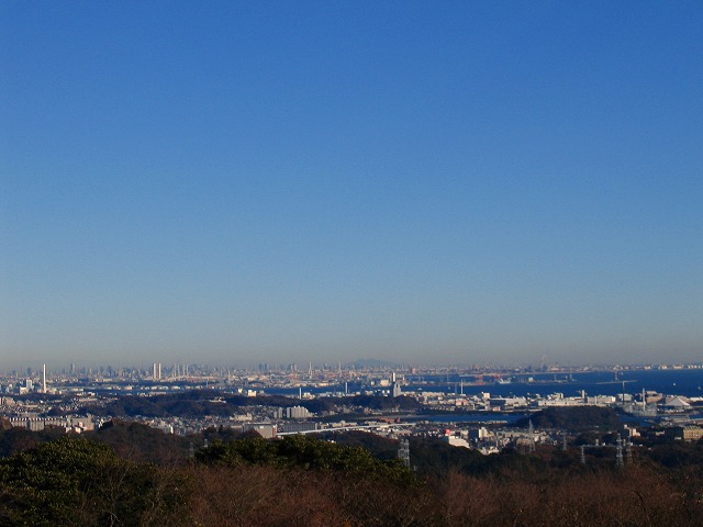 二子山から横浜・都内方面の眺め。この日は稀に見る視界の良さで都内はもちろん、なんと筑波山が!産業活動の停止する正月でもなかなかお目にかかれない景色です。